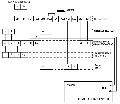 Je nach gewünschten Funktionen erfolgt der Anschluss über eine Türsprechstellen- (TFE/V)-Adapterbox mit Verstärker (S30817-Q936-A313, mit Einschaltekontakt)