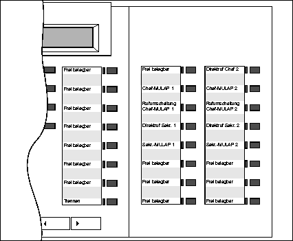 auf erste freie Tasten Freie Tasten auf dem EG und eventuell vorhandenen Bestellgeräten werden genutzt. Bei fehlenden freien Tasten werden optiset E key modules addiert. Reihenfolge der Tastenvergabe für Top: Direktruftaste Chef 1, Chef-MULAP 1, Rufumschaltung Chef-MULAP 1, Direktruftaste Sekr. 1 (bei Chef-EG) oder Gruppenruftaste Ein/Aus (bei Sekr.-EG), Direktruftaste Chef 2, Chef-MULAP 2, ... |