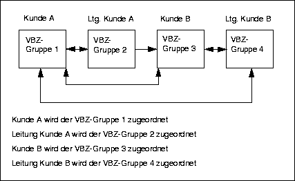 Was wurde bisher eingerichtet: - Die Kundenrufnummern - Tln. 100-109 (Kunde A) sind schon im Standard der VBZ-Gruppe 1 zugewiesen - Zuordnung Tln. 110-119 (Kunde B) zu VBZ-Gruppe 3 - Zuordnung Leitungen (Kunde A) zu VBZ-Gruppe 2 - Zuordnung Leitungen (Kunde B) zu VBZ-Gruppe 4